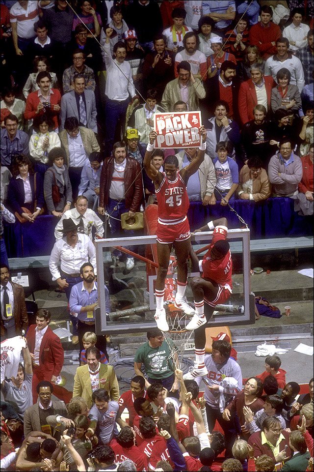 The irony of the Wolfpack’s victory was that the game-winning point was scored on a dunk over the Houston Cougars, also known as Phi Slamma Jamma (Dunking Fraternity), a team that was known for the dunking exhibitions that they put on during pre-game warm-up and during their games.